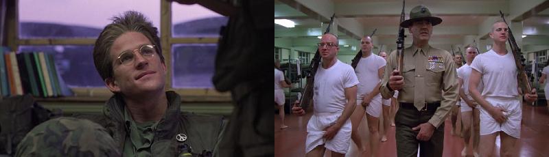 Toujours apte à ébranler les conceptions d'humanité et de barbarie, de civilisation et d'asservissement, fasciné et terrifié par la marge infime qui distingue le soldat du criminel, Kubrick consacre les trois premiers quarts d’heure du film au laboratoire où se contracte le virus : le camp d’entraînement de Parris Island, institution totalisante spécialisée dans la dépersonnalisation de l’embrigadement. Prestement dépouillés de leur individualité puis systématiquement dégradés par un déluge d’insanités, les conscrits sont soumis à l’autorité insane du sergent Hartmann, fou furieux vociférant qui leur fait tout faire, le parcours du combattant, le lit au carré, la corvée de chiottes. Son objectif est de fabriquer une section de tueurs à partir d’éléments disparates. Peu importe l’abjection des moyens, le travail sur les mots, les noms des soldats et des armes, le pansexualisme délirant et outrancier, tous soulignés par le motif répété des travellings arrière, ceux de l’escadron en marche avec ses chants idiots, ceux de l’instructeur dans un dortoir aussi propre et artificiel que les couloirs de 2001. La guerre nécessite la mise à l'équerre de l’individu, et la méthode employée vise l’effet inverse du programme Ludovico dans Orange Mécanique : elle glorifie l’agressivité primaire, l’instinct carnassier, l’ivresse du sang. Ainsi l’officier-enseignant métamorphose-t-il rapidement son groupe de dadais en un régiment robotisé, une meute d’exterminateurs impeccablement ordonnée. À la quarante-cinquième minute, le gros Pyle, garçon de ferme un peu crétin dont Hartmann a fait son souffre-douleur, apparaît complètement déglingué. Il rôde dans les latrines avec son fusil-mitrailleur, affectueusement baptisé Miss Charlene et garni de balles chemisées de métal. L’une éparpille en débris le tyran haï, une autre met fin par voie buccale à sa carrière prometteuse de tireur d’élite, après qu’il se soit assis pour la circonstance sur le trône blanc de son ultime défoulement.