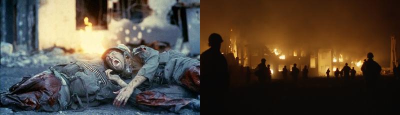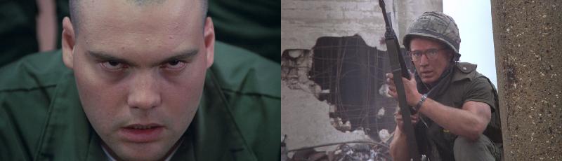 Province comme une autre du vaste paysage mental kubrickien, le Vietnam agit ici comme catalyseur d’une psychose secrétée par l’armée elle-même. Le cancer que diagnostique le chirurgien-réalisateur prend naissance au cœur du système et de la hiérarchie militaires : il y retrouve cette violence institutionnalisée qu’il avait disséquée dans Les Sentiers de la Gloire, dénoncée dans Spartacus et ridiculisée dans Docteur Folamour. Des troufions sans passé ni avenir y constituent une chair à canon parfaitement malléable. Tel un seigneur de la guerre qui avancerait au feu en coupant derrière lui tous les ponts de la retraite, le cinéaste fait le pari de sabrer consciencieusement toute possibilité d’identification. Un instant on croit pouvoir s’accrocher au destin de Joker (qui prête à plusieurs reprises sa voix off au récit, et à qui un peu de substance biographique est concédée) mais ce n’est que pour mieux le replonger au plus profond d’une grisaille de figures interchangeables. Le sergent instructeur ne gagne sa consistance sonore (une ahurissante diarrhée d’insultes) qu’au prix d’un silence définitif, étant dégommé à mi-parcours. Même l’éternelle sortie de secours de la psychologie est verrouillée : tous les personnages ont des émotions mais aucun caractère, répliquant simplement à l’infini quelques standards du comportement humain (racisme, héroïsme, couardisme, connerie, intelligence, misogynie...). Quant au dernier recours des justifications politiques, historiques ou idéologiques, le cinéaste les anesthésie les unes après les autres : à peine quelques citations aide-mémoire, exhibées à la manière d’un document d’archive, prenant intelligemment en compte que le Vietnam fut la première guerre à être mise en images, immédiatement, en direct, à la télévision américaine, presque comme une campagne publicitaire. Le film ignore à dessein les grandeurs et servitudes de soldats embourbés dans un combat douteux, tout comme les motifs iconographiques de rigueur : ni jungle, ni napalm, ni drogue, mais une bataille indéterminée dont la logistique rappelle la Corée ou même la Seconde Guerre mondiale.