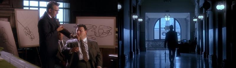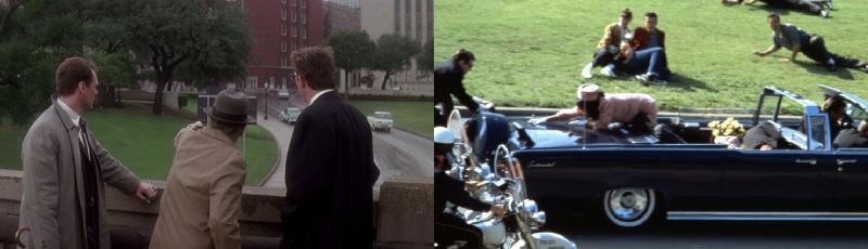 Un seul texte ne suffirait à rendre compte de l’exceptionnel et méticuleux travail de montage dont l’œuvre est le résultat. J.F.K. se place à la crête de la profession sur l’image-preuve ("pas une image juste, juste une image") dont Brian De Palma s’est fait le chantre le plus fameux. Le maelstrom incandescent de la forme, la prolifération endémique des plans, le brassage des différents régimes temporels, tout concourt à un genre de puzzle contradictoire, de chaos signifiant au sein duquel le spectateur est amené à participer pour détecter l’argument et l’indice, trier le vrai du faux. On pourrait presque qualifier d’expérimentale la manière dont le cinéaste pense le rapport dialectique des plans, recourt aux flashs mentaux, aux pièces accusatrices comme des éléments à charge ou, inversement, aux insertions ambigües et incertaines comme des supputations floues, des divagations avortées. En tournant Zelig, Woody Allen s'était révélé un remarquable copiste d'images des années cinquante. Stone va plus loin, dupliquant au plus près des documents connus de tous : le film de Zapruder, les émissions de télévision en direct ou en différé (comme la célèbre intervention de Walter Cronkite annonçant d’une voix brisée la mort de JFK), les photos publiées dans les journaux, un continuum allant du film à la vidéo, du 8 mm au 16 mm et au 35 mm, tantôt en noir et blanc, tantôt en couleurs, et qui visent à reproduire avec ses acteurs les évènements connus, mais aussi ce qui n'a pu être filmé à l'époque. La séquence où sont montés parallèlement une réunion de l’équipe de Garrison et l’élaboration du cliché truqué montrant Oswald un fusil à la main (lequel ne réapparaîtra que beaucoup plus tard dans le récit) fonctionne presque comme un commentaire du réalisateur sur son propre ouvrage de faussaire. Son tour de force est de dompter une matière foisonnante jusqu’au vertige, d’assurer la progression du spectateur dans le dédale des suppositions en lui offrant un véritable panoramique sur ces puissances de l’ombre qui semblent assurer une gouvernance parallèle de la nation. À sa manière, J.F.K. un très grand film paranoïaque où planent les menaces les plus invisibles, où se profile l’envers de la florissante Amérique des sixties. Fruit d’une documentation colossale, le long-métrage scanne une multitude de faits, de pistes, de théories, de traces puisés aussi bien dans les replis de la grande histoire (on y évoque pêle-mêle ce qui pourrait alimenter vingt romans d’espionnage : les agissements d’Allen Dulles, les "opé noires" menées pour déstabiliser les gouvernements étrangers, la guerre secrète contre Castro, le crash de l’avion-espion de Francis Gary Powers et ses conséquences diplomatiques, les tractations occultes des services de renseignement, les tensions parcourant les coulisses du pouvoir à Washington…) que dans les turbulences traversées par le quotidien de l’attorney, qui bascule sous les effets de la tempête médiatique.