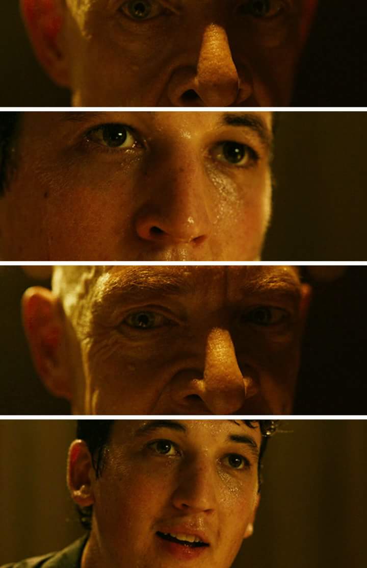 Andrew, qui contrairement à son géniteur n'a pas la possibilité d'écrire un film pour séparer en deux entités distinctes les deux éléments à réconcilier pour enfin se libérer de son existence, choisira ce qui lui apparaît comme évident : le dévouement à son art. Le premier plan du film, passé les premières secondes uniquement sonores, nous le raconte visuellement et immédiatement. Le musicien, penché sur sa batterie comme on se pencherait pour se couper du reste du monde, se complaît dans la petite pièce éclairée chaudement à pratiquer son instrument. Un endroit restreint, personnel, fait de passion et de sueur, où il peut se lover pour continuer sa route. Une route qui ne va cependant que dans un seul sens : à l'intérieur de soi. La caméra mettra en relief le chemin à parcourir, cette fois-ci vers l'extérieur. Car dans Whiplash, tout part de cette opposition entre intérieur et extérieur, ou passion et réalité, et comment les réconcilier. L'extérieur, toujours dans ce même plan, sera verdâtre, triste, mais surtout long, très long. (1)
