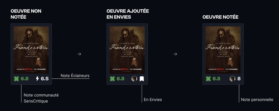 Les notes, vous le savez, on aime ça. Et des types de notes, il y en a beaucoup sur SensCritique. En plus de la moyenne, il y a la note éclaireurs, sa propre note et celle des autres utilisateur·rices. On a donc décidé de simplifier leur affichage, dans l’idée de rendre plus lisible les informations importantes.