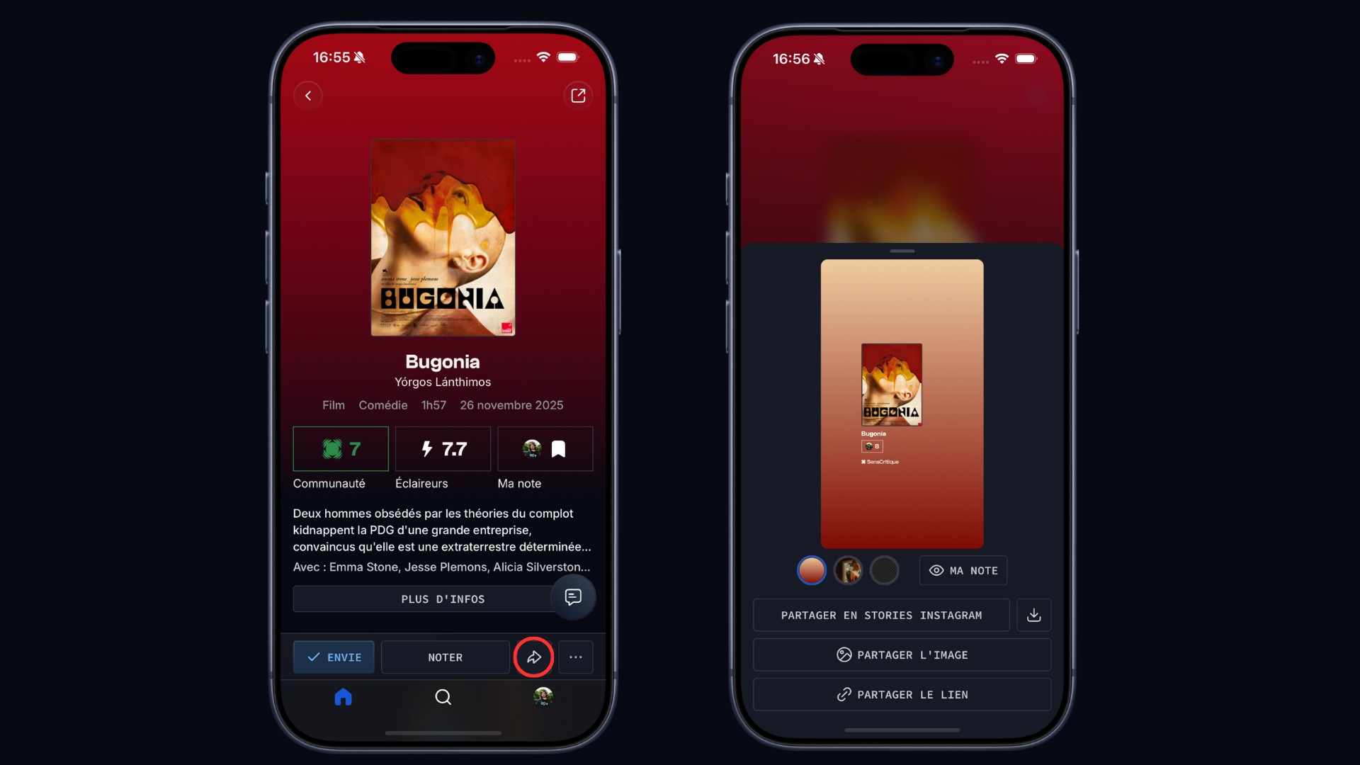 Côté fonctionnalités, nous vous proposons une nouveauté : le partage de vos avis sur vos réseaux. En effet, même si certains de vos ami·es ne sont pas (encore) membres de SensCritique, vous pourrez leur partager facilement vos notes et vos derniers coups de cœur.