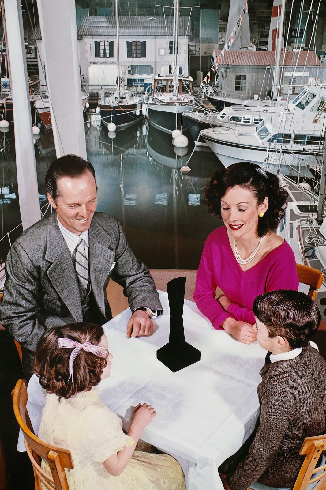 "Led Zeppelin! Christ, what was bigger than Led Zeppelin? The most powerful and notorious band in the galaxy. Musically, personally, managerially and mythically. So how the hell do you approach design for such a colossus? Well, firstly, with great trepidation, and then secondly with courtesy and diplomacy, deference at all times, and then with a strong desire to please and not upset nor disappoint. We needed something so powerful, so huge that it made you weak just to think of it. And what did we come up with... a little bitty black object sitting on an ordinary table surrounded by a rather ordinary family. An ordinary family? What's the power in that? But no ordinary setting this, and certainly no ordinary object. Perhaps it was a cosmic battery, or a spiritual relic or alien artifact, exposure to which seemed essential - it filled your life, it sustained you, it bathed you in mysterious emanations. It was vital for growing infants, for education, useful to science and financial institutions, handy for both leisure and sport, indispensable even to romance. It was central to everyday existence - utilitarian, religious and addictive. So powerful that back in those days everyone had one, so powerful that nowadays one didn't need one any longer, so pervasive that the memory alone would suffice, so powerful that it didn't actually need to be there, no depth cues nor shadows cast by the object, more a hole than a thing, an absence rather than a presence. So powerful that the mere suggestion was enough, like a secretly whispered word, like a radical idea or a desert wind, substantial but not needing substance, just like the band, their music and their reputation. Much to our surprise, and I think to their credit, they embraced it wholeheartedly, entitling the album after the image. I hope they love it still, as much as I do."