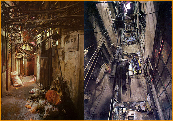 La citadelle de Kowloon (à voir à partir de la 45ème minute) : http://3.bp.blogspot.com/-W_Qth_NcW4E/TxajlZZEqxI/AAAAAAAAAS8/NUlHVB-DsYk/s640/kowloon-walled-city-rubbish-alley.jpg