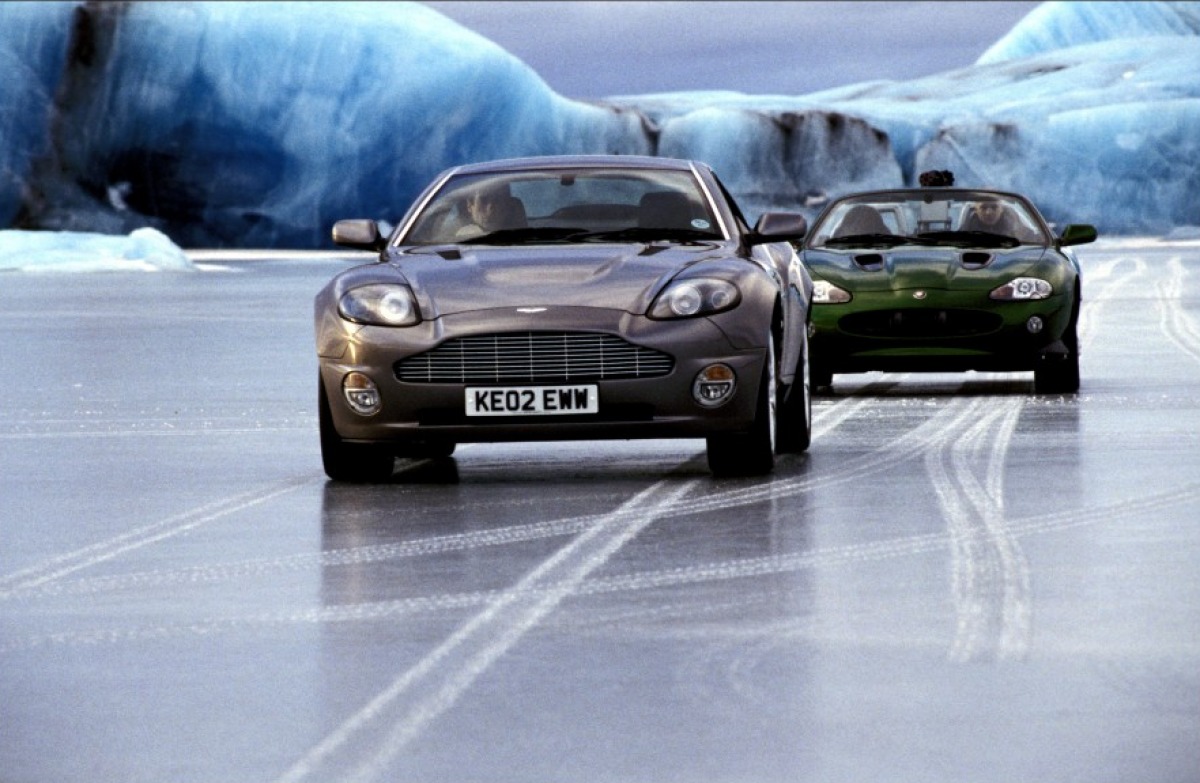 duel de voitures sur la glace islandaise entre Aston Martin et Jaguar XKR Roadster