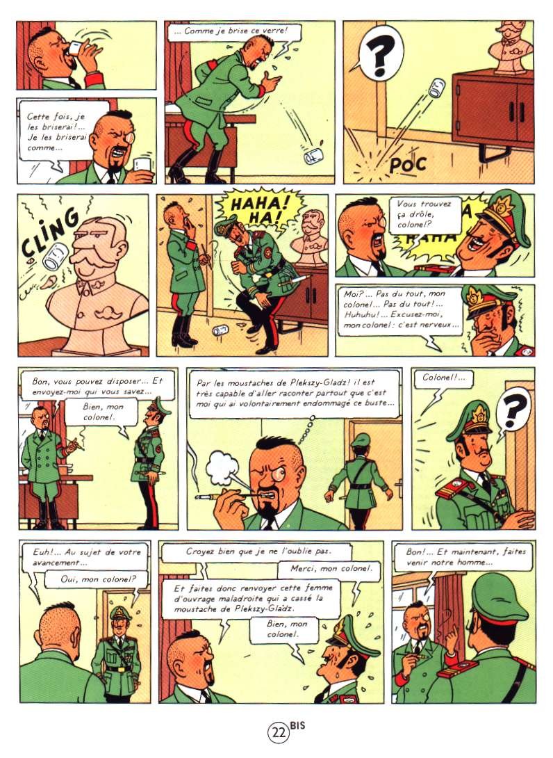 Hergé nous offre quelques très belles case (la moto accidentée dans le virage) et planche (Tintin abattu de nuit par la D.C.A. syldave), mais on est toutefois un peu déconcerté par le décorum de la cour du roi, beaucoup trop fin XIXe siècle : on se croirait à la cour de François-Joseph d'Autriche ou dans LE PRISONNIER DE ZENDA, mais pas à la fin des années 1930. Hormis ce choix discutable, l'aventure est très valable.